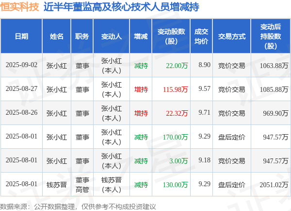 恒实科技近半年内的董监高及核心技术人员增减持详情如下: