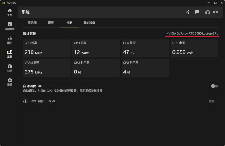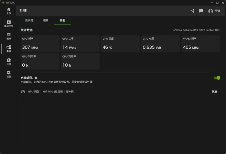 这项功能位于NVIDIA APP的系统——性能选项下,在统计数据下方就有自动调优。打开自动调优后,软件会进行一段时间的自动调整,时间不算短,基本在30分钟左右。注意此时尽量不要运行任何软件,也要避免系统休眠。自动调优之后,软件会给到一个增加了多少核心频率的结果,这个结果往往不会很高。比如我手上一台RTX5060游戏本增加了87MHz,一台RTX5070游戏本也增加了87MHz,都比较保守。