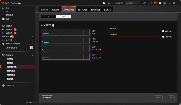 第一个方法适用于部分搭载RTX50系显卡的游戏本,比如惠普、联想、华硕、微星等。这些游戏本预装了性能控制软件,其中就提供了显卡核心频率和显存频率调节的功能。这里以惠普为例,旗下的OMEN暗影精灵预装的OMEN Gaming Hub中,在性能控制——高级性能调整——GPU下,就能够看到显卡核心频率和显存频率调节选项,其中核心频率最高可提升200MHz,显存频率最高可提升400MHz。大家可以根据自己的需求调整,实际测试下来,显卡性能有小幅提升,即使全部拉满,过程中没有遇到死机情况,还是很稳定的。
