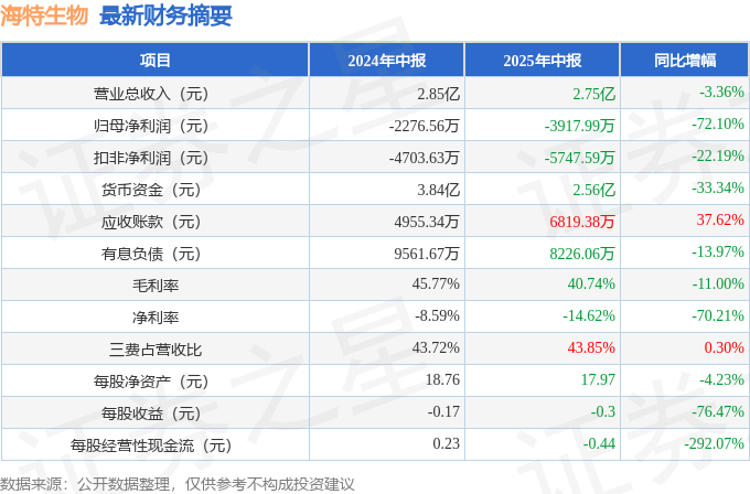 据证券之星公开数据整理,近期海特生物(300683)发布2025年中报。根据财报显示,海特生物净利润同比下降72.1%。截至本报告期末个人配资网,公司营业总收入2.75亿元,同比下降3.36%,归母净利润-3917.99万元,同比下降72.1%。按单季度数据看,第二季度营业总收入1.18亿元,同比下降22.49%,第二季度归母净利润-2524.95万元,同比下降305.94%。