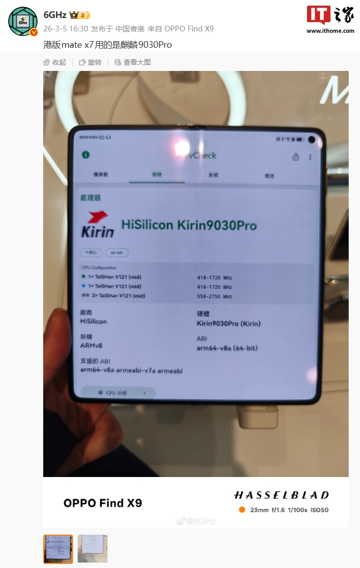 据博主 @6GHz 透露,港版华为 Mate X7 折叠屏手机搭载麒麟 9030 Pro 处理器。