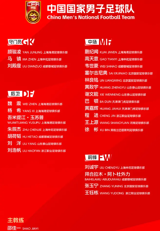 在门将的位置上,邵佳一的选择是上海海港的颜骏凌、成都蓉城的刘殿座和上海申花的马镇。做出这样的选择让人有点摸不着头脑,颜骏凌和刘殿座都已经是35岁的老将,虽然门将这个位置上经验非常重要,但是在新的国家队比赛周期里,年轻人应该获得更多的机会,否则下一届世界杯很难顶上。如果说颜骏凌和刘殿座的入选还有发挥和比赛能力的原因,马镇的入选就更加让人吃惊了。
